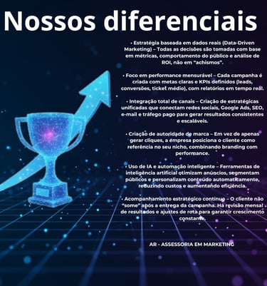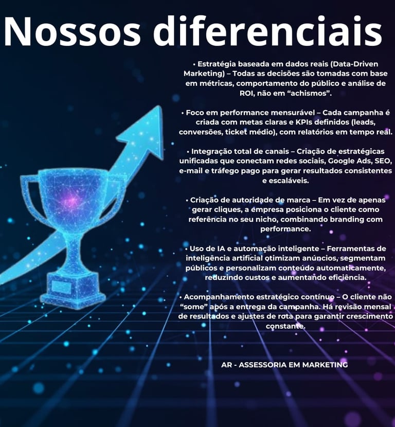 Nosso time atua com foco em resultados mensuráveis, utilizando ferramentas de inteligência artificial e automação para otimizar campanhas, reduzir custos e maximizar o retorno sobre investimento.